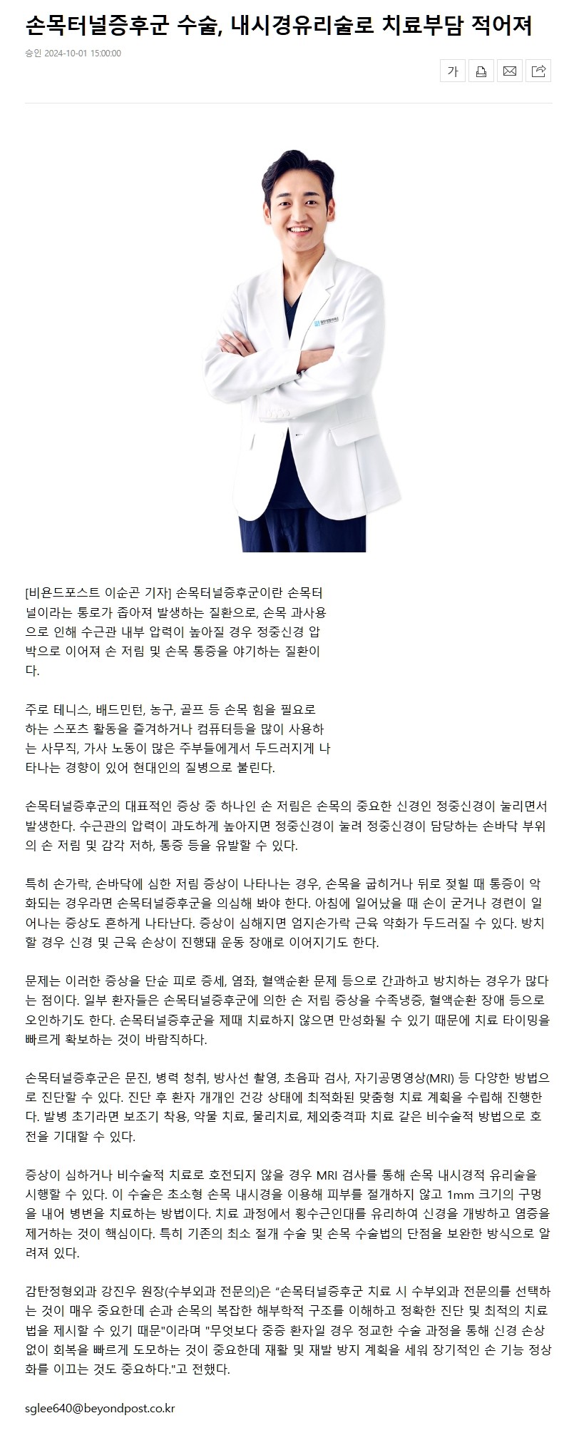 제목 [언론보도] 손목터널증후군 수술, 내시경유리술로 치료부담 적어져