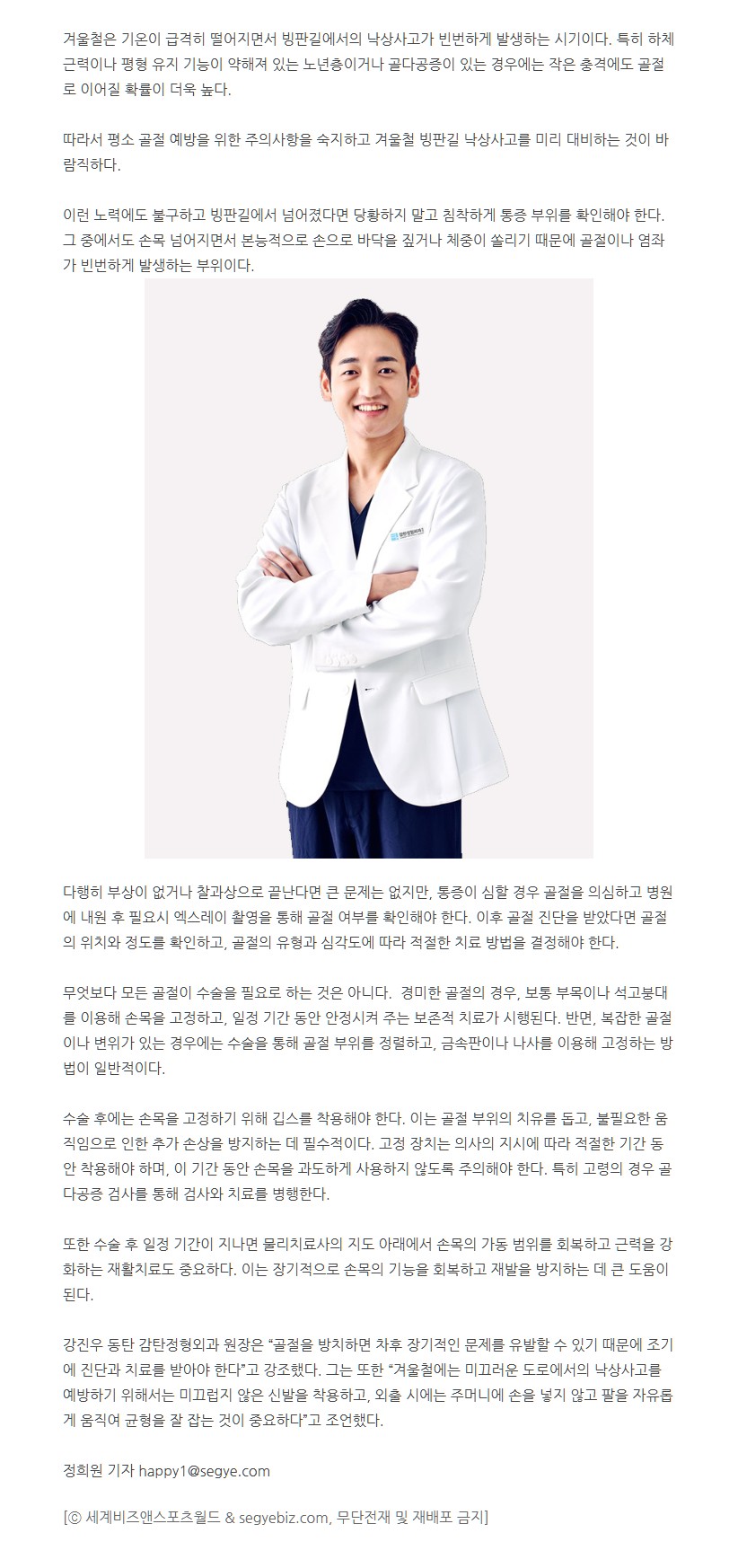 [언론보도] 빙판길 낙상사고에 욱신욱신 ‘손목 골절’… 방치 마세요
