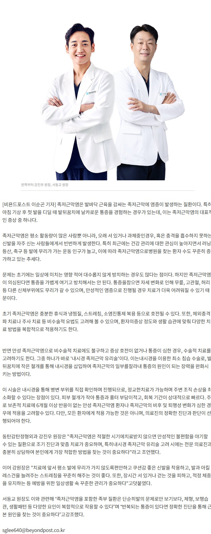 [보도자료] 족저근막염 수술, 더 작고 섬세하게! '내시경 족저근막 유리술'의 원리는?