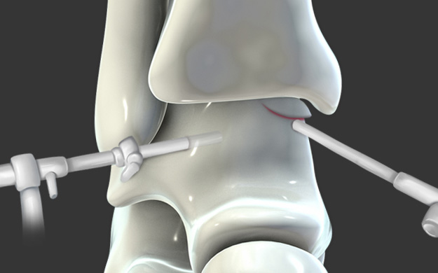 관절경을 통하여 손상된 연골 부위를 정리하고 뼈에 작은 구멍을