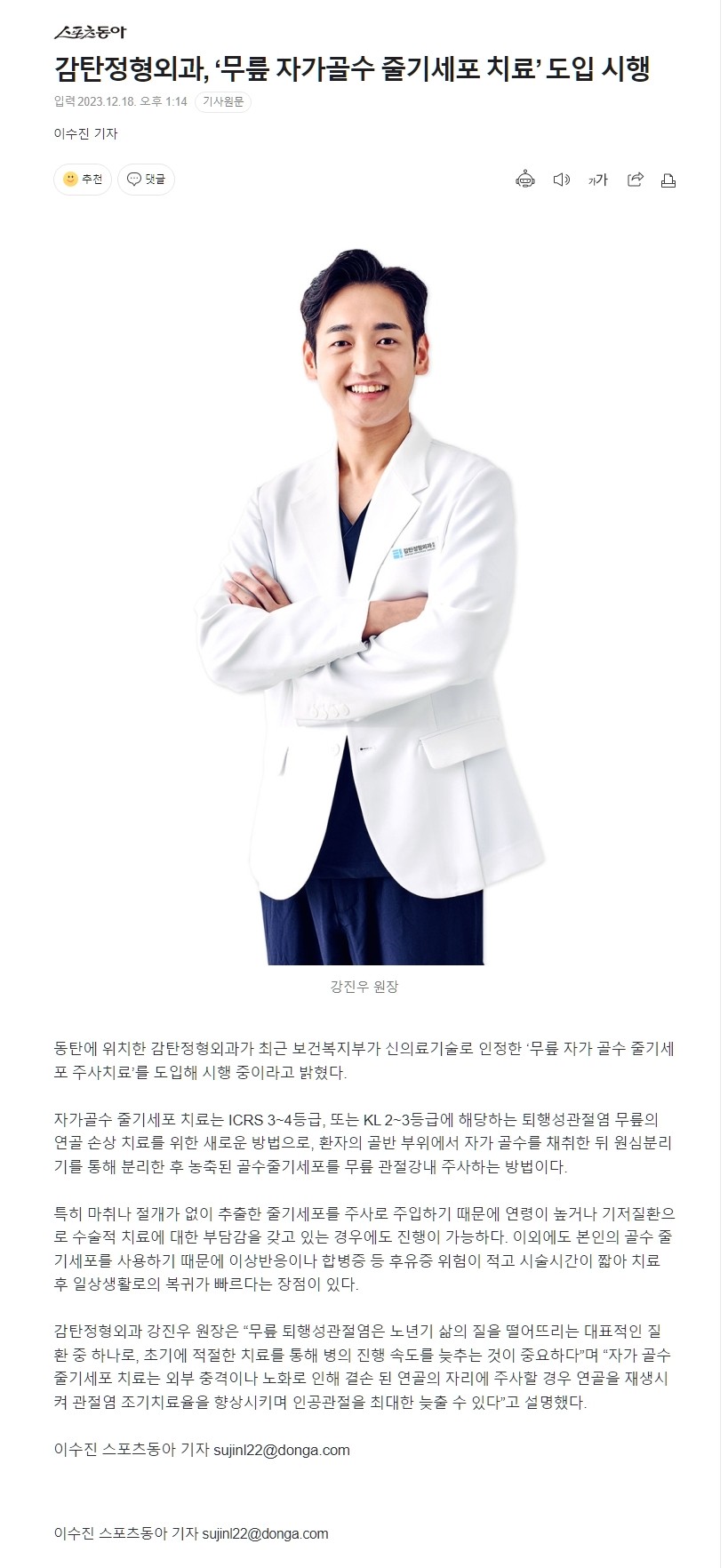 제목 [언론보도] 감탄정형외과, ‘무릎 자가골수 줄기세포 치료’ 도입 시행 / 스포츠동아