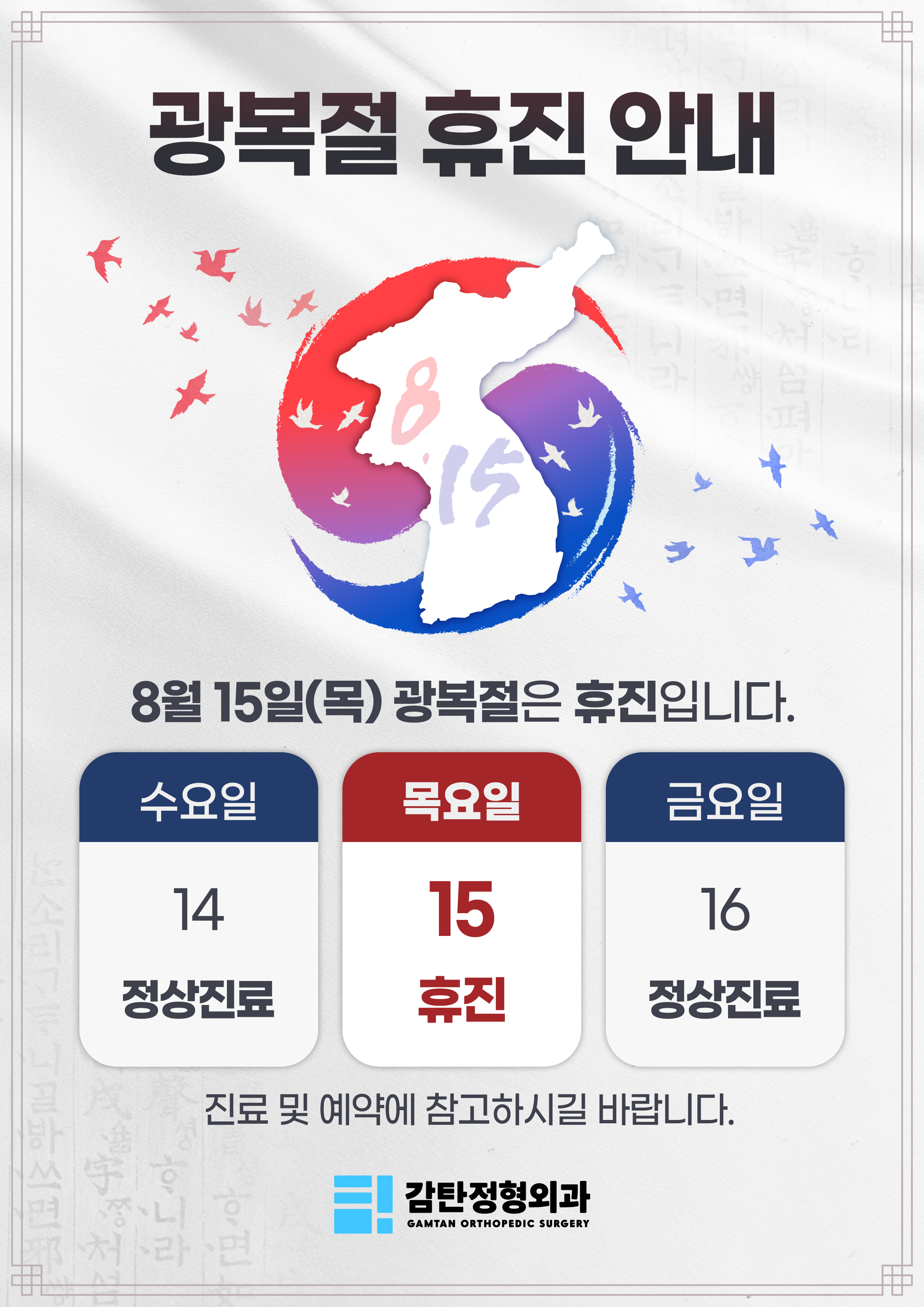 제목 8월 15일(목) 광복절 휴진안내