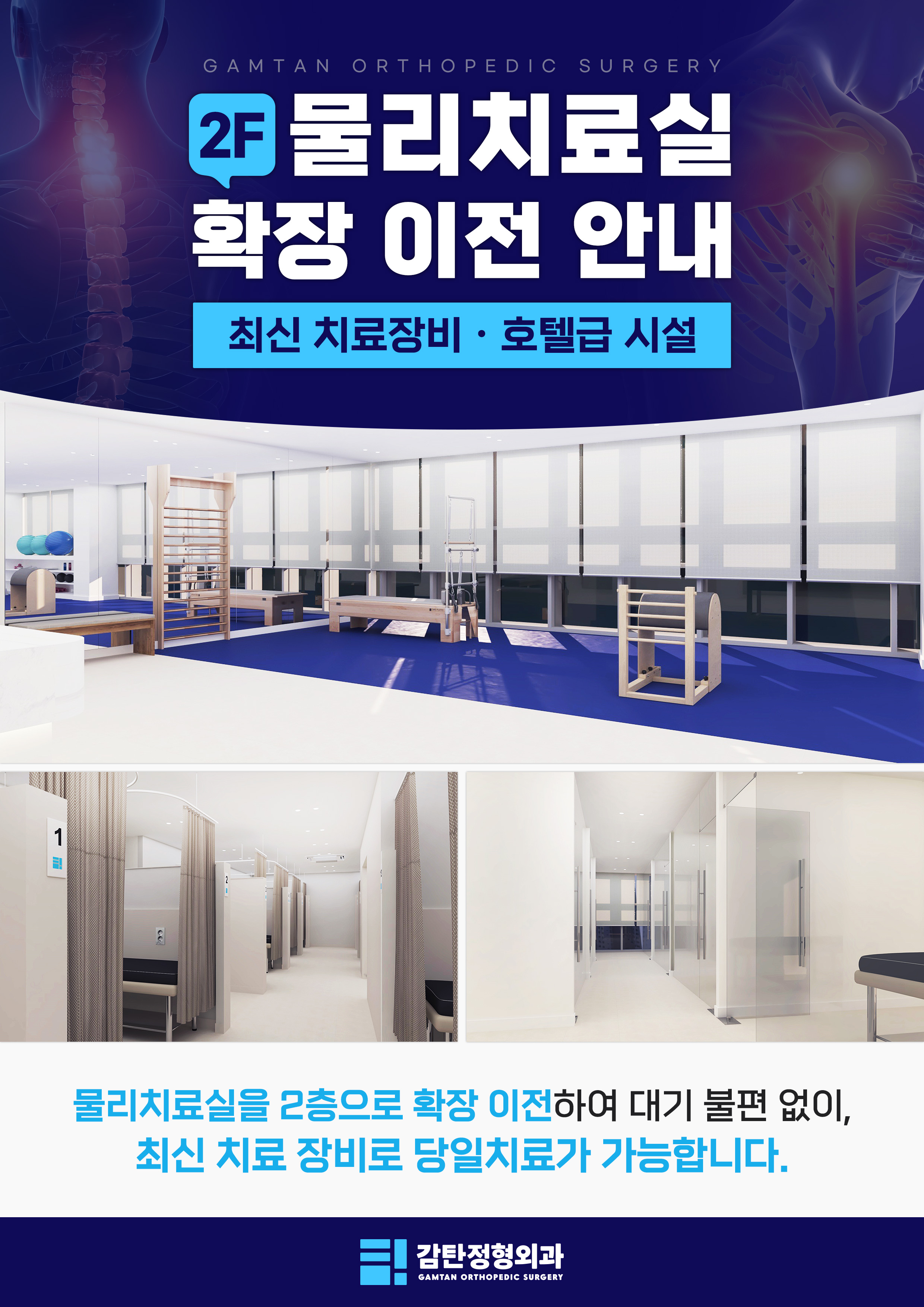 동탄을 대표하는 감탄정형외과는 기존 3층에서 2층으로 이전하여, 공간을 200평 규모로 확장하였습니다. 이번 확장은 물리치료실의 기능적 개선과 함께 환자들에게 보다 나은 치료 환경을 제공하기 위한 조치로 시행되었으며, 그동안 빠른 환자증가추세에 맞춰 개원 1년이 되지 않은 시점이지만 환자 대기 불편을 감소시키고자 특단의 대책으로 물리치료실을 가량 확장하였습니다.
