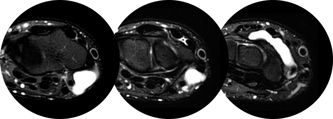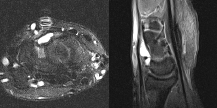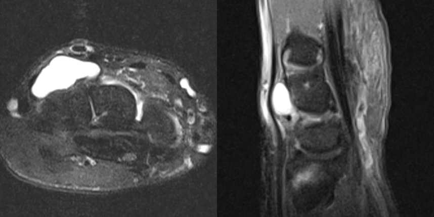 만약 MRI 를 찍지 않았다면 손목 앞쪽에 보이는 결절종만 제거하여 재발 가능성이 높을 수 있는 경우입니다.