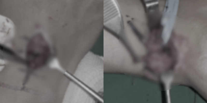 다음 사진들처럼 수술시 관절에 연결된 뿌리까지 찾아서 제거하여야 재발하지 않기 때문에 수술자의 기술이 특히 중요한 수술입니다.