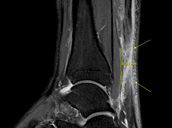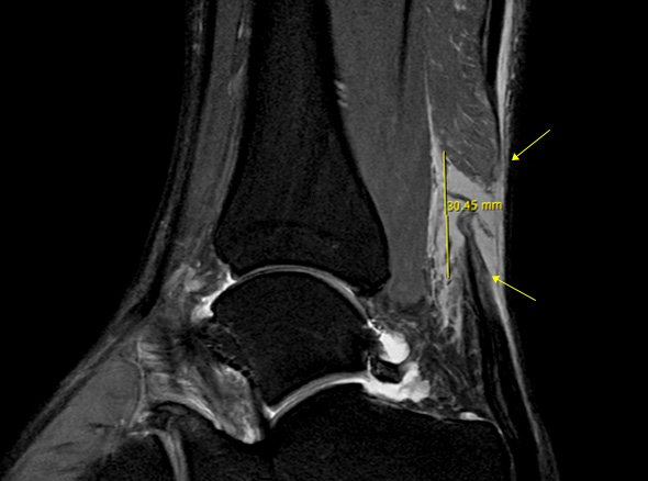 MRI를 이용하면 초음파보다 더 정확하게 아킬레스건의 파열을 볼 수 있으며, 동반 손상된 부위가 있는지도 확인할 수 있습니다.