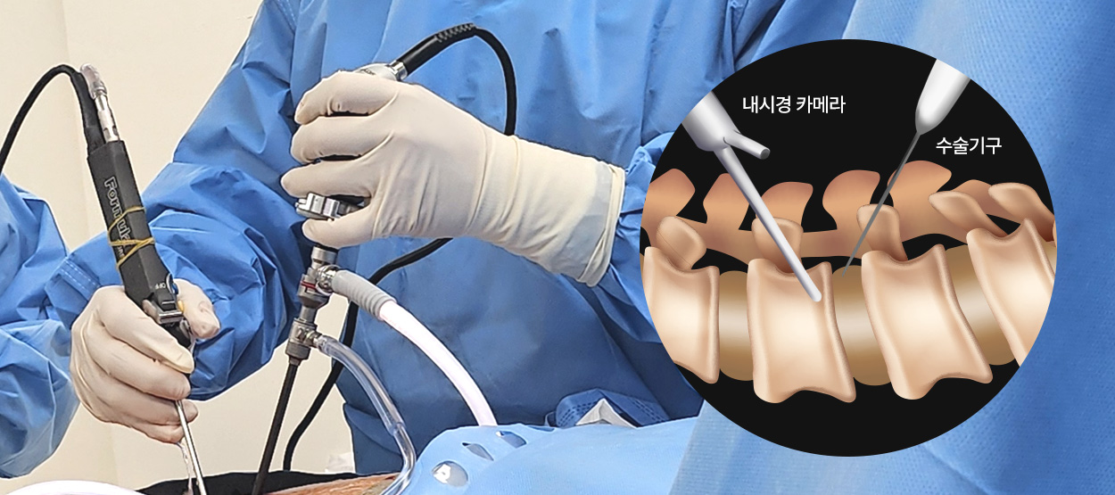 양방향으로 삽입된 미세 내시경과 수술 기구들은 정상조직인 근육과 인대를 거의 손상하지 않고 병변 부위에 접근합니다.